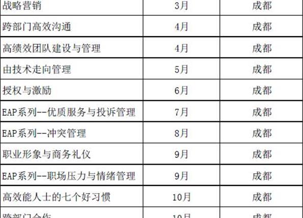 课程主题时间地点跨部门高效沟通3月成都咨询式管理者L13月成都领导力提升(基础)3月成都优势谈判4月成都咨询式管理者L24月成都消费心理与行为分析5月成都员工职业素养提升5月成都EAP系列——冲突管理6月成都咨...